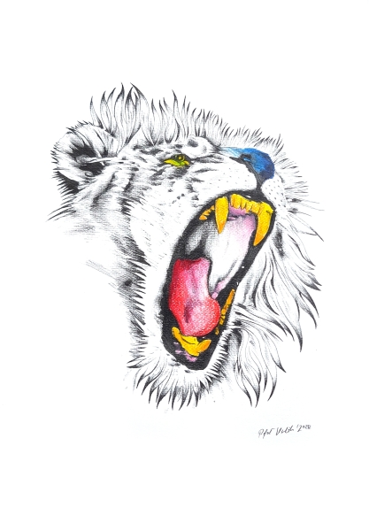 Lew - ołówek, kredka na papierze 210g. - 30x42cm