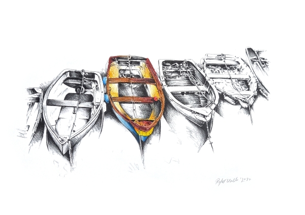 Samotne łódki - ołówek, kredka na papierze 210g. - 30x42cm