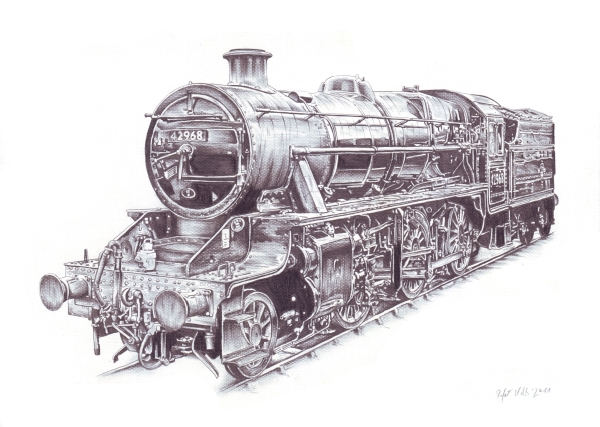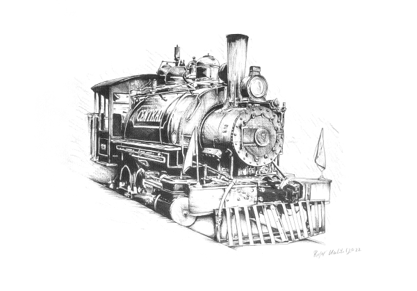 Zabytkowy parowóz - ołówek, kredka na papierze 210g. - 30x42cm