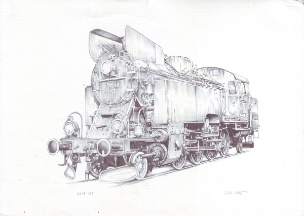 Parowóz TKt-48-151 - ołówek na papierze 210g. - 30x42cm lekki DEFEKT ze względu na wiek pracy. Możliwość wykonania podobnego rysunku na zamówienie