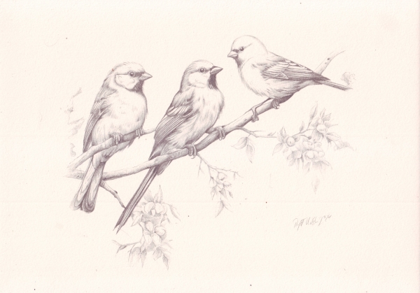 3 tańczące wróble - ołówek, kredka na papierze 210g. - 30x42cm