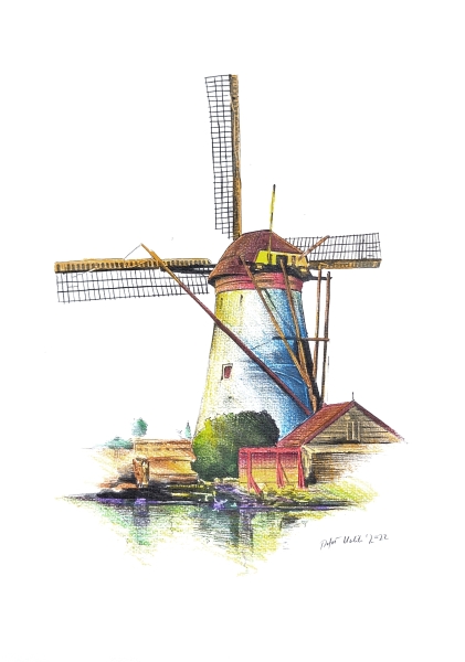 Wiatrak holenderski - ołówek, kredka na papierze 210g. - 30x42cm